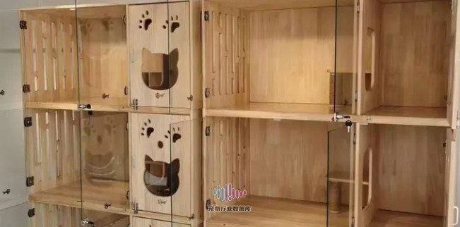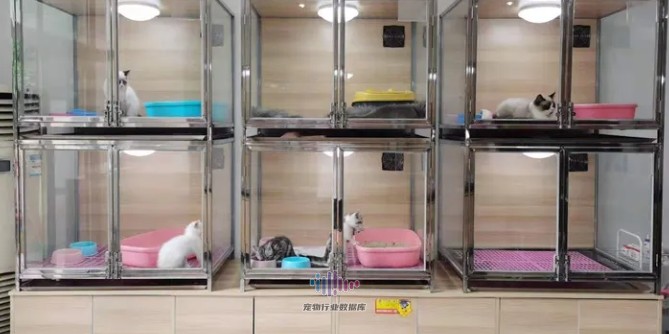 或者考虑采用不锈钢、缝隙全部用玻璃胶封死、三面玻璃利于展示、内部安装灯光和抽风机,隔绝客人随意触摸、上一层的猫砂只能漏到下面的托盘,不影响旁边以及下一层的猫、同时美观度也不差